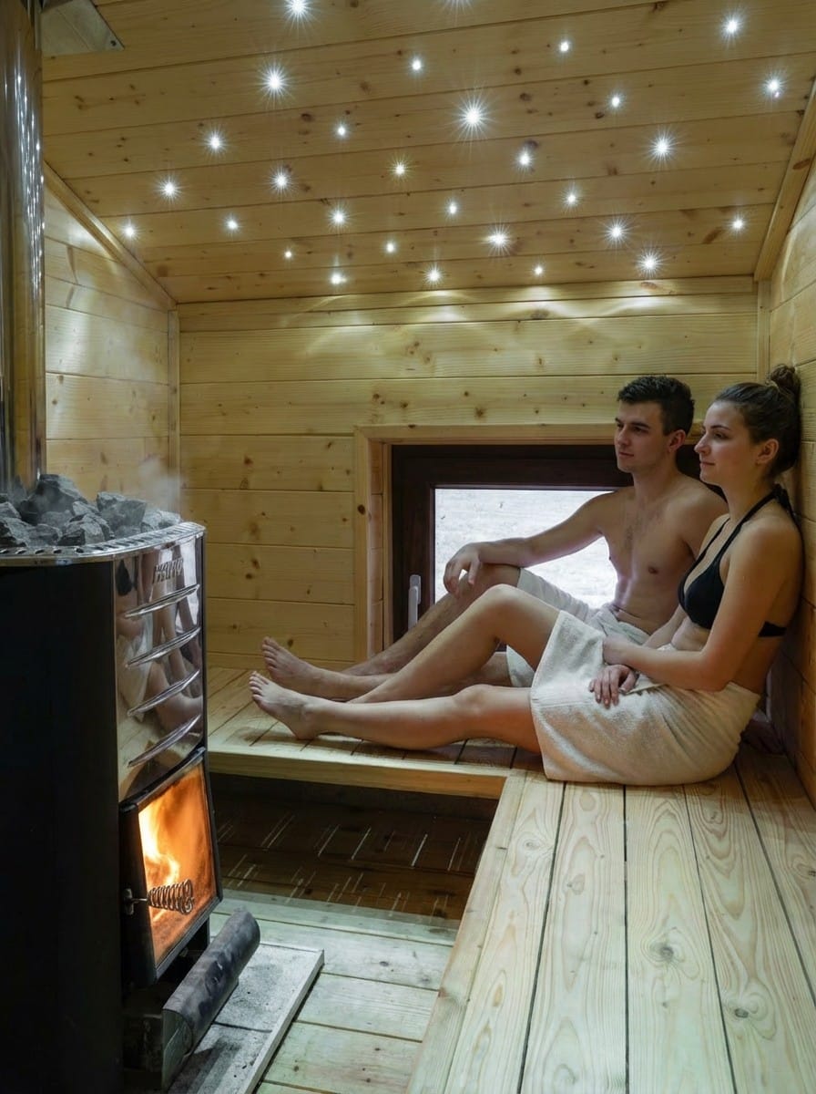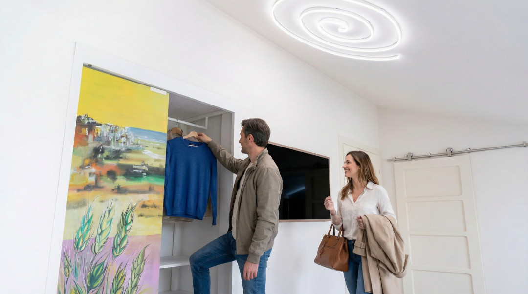 Soffitto sottotetto spiovente e lucernari. Dotata di mini spa privata con sauna a legna in camera, aria condizionata e domotica completa per luci, TV Samsung tipo quadro arte, condizionatori, e porte con apertura tramite codice, impronta o tessera. Letto matrimoniale, frigobar, cassaforte e armadio a muro con ante decorate dall’opera originale 'La vite' di Marco Franchini. Esclusiva mini spa interna include sauna a legna privata per un'esperienza di relax unica. Tavolo con due sedie per cene intime. Comfort esclusivo e design raffinato per un soggiorno indimenticabile. Accesso sicuro con porte ad apertura tramite codice, impronta o tessera.