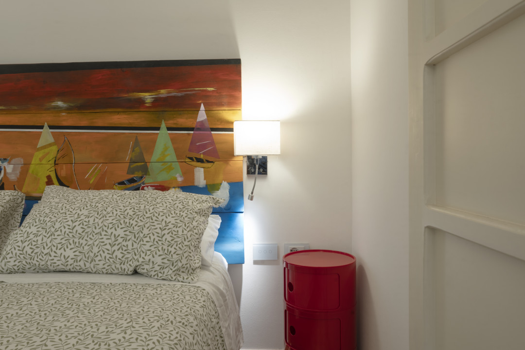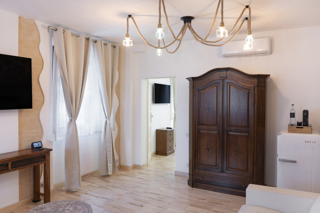 Suite con 2 stanze Situata al primo piano, la camera Efialte è ideale per famiglie o gruppi fino a 4 persone. Dispone di una stanza notte con letto matrimoniale e una zona giorno con divano letto utilizzabile come letto aggiuntivo. Dotata di frigobar, cassaforte, aria condizionata e smart TV. Le testate del letto e i quadri sono opere originali di Marco Franchini, ispirate al mare. Accesso sicuro tramite porte con codice, impronta o tessera. Completano la camera un tavolo con 4 sedie per cenare comodamente e una macchina per caffè e tisane offerte gratuitamente.