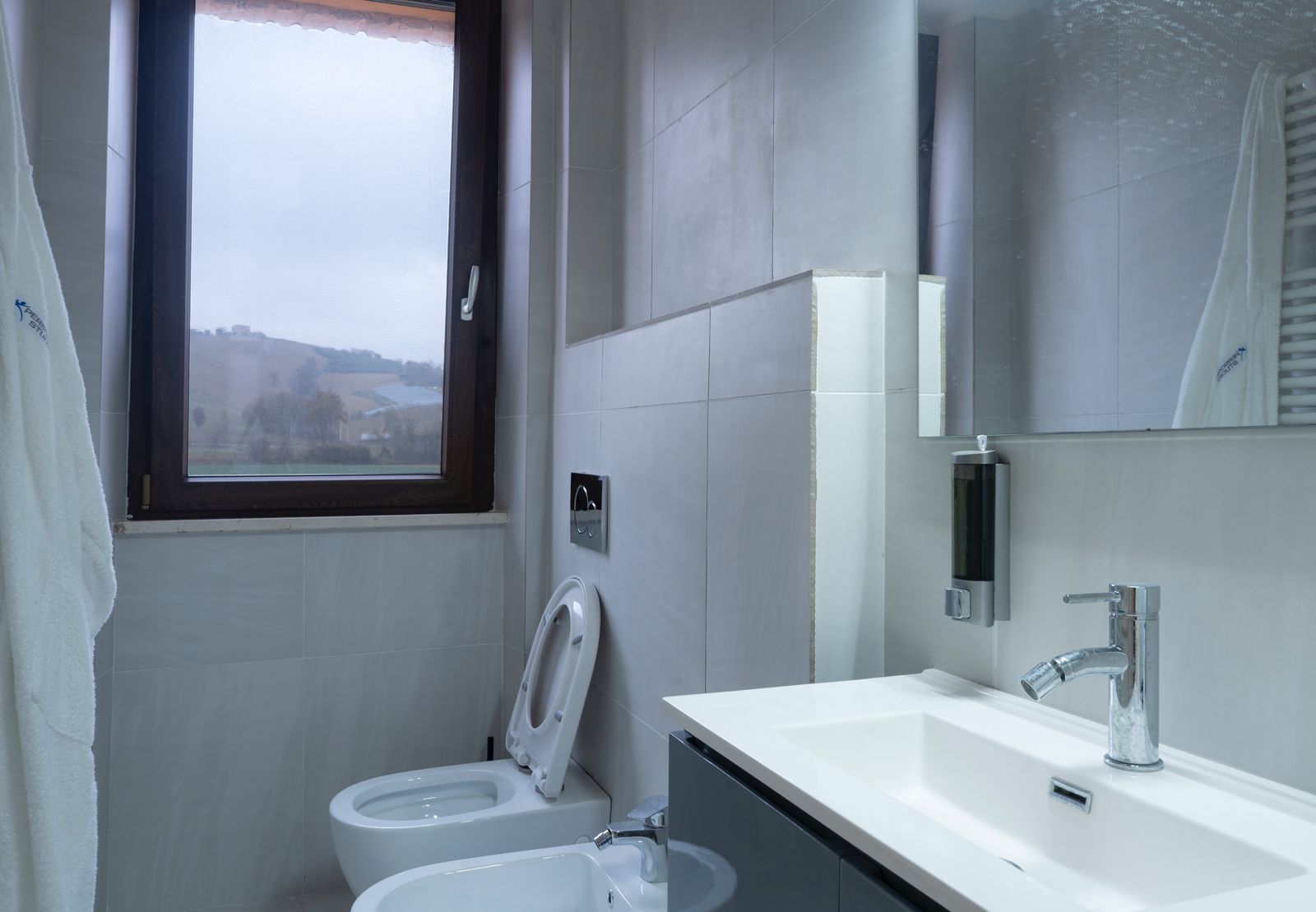 Sottotetto spiovente con lucernari. Dotata di mini spa privata: sauna a legna e vasca idromassaggio. Letto matrimoniale, frigobar, cassaforte e armadio a muro con ante decorate dall’opera originale “Il grano” di Marco Franchini. Ambiente domotizzato per luci, aria condizionata, TV Samsung tipo quadro arte e apertura porte tramite codice, impronta o tessera. Tavolo con due sedie per cenare in camera. Comfort ed esclusività in ogni dettaglio.